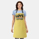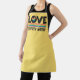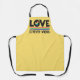 LGBTQ Pride hellgelbe Schürze mit der Liebe von Beschriftungen ist Niemals falsch in schwarzen Schriften mit einem kleinen Regenbogenherz und Regenbogenflagge verziert.