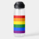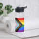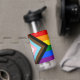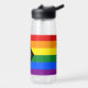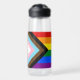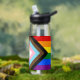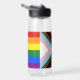 Wasserflasche: Die Regenbogenflagge und die "Progress"-Variante fügen ein Zickzack entlang des Wasserhais hinzu, das schwarze, braune, hellblaue, rosa und weiße Streifen aufweist, um diese Gemeinschaften (marginalisierte Farbmenschen, TransIndividuen, HIV/AIDS-Bewohner und Verlierer) an die Spitze zu bringen; "der Pfeil zeigt auf, dass nach vorn, während er am links Rand ist, der Fortschritt noch notwendig ist hergestellt.