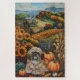 Feiern Sie die Schönheit des Herbstes mit diesem lebendigen Gemälde eines Hundes, der neben einer reichen Erntedank-Ernte sitzt. Die reichen Herbstfarben von Kürbissen, Sonnenblumen und die rustikale Landschaft der Bauernhäuser schaffen eine warme und einladende Atmosphäre, die sich perfekt für jeden Hundefreund im saisonalen Dekor eignet.