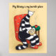 Bibliothekposter für einen Katzenliebhaber mit einer lustigen Illustration einer seltsamen, schwarz-weiß gestreiften Katzenkreatur mit langen Nacken, die auf der Zuhause bleibe. Dieser seltsame Charakter bleibe Zuhause, sitzt friedlich auf einem orangefarbenen Stuhl mit Augen, entspannt und liest ein rätselhaftes Buch. In den Hausschuhen, die mit den Augen geschmückt sind, genießt es eine heiße Tasse Kaffee. Das Tee hat den anpassbaren Text "Meine Bibliothek ist mein Lieblingslokal".