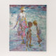 Eine Mutter, deren Sonnenhut sanft geneigt ist, führt zwei Kinder durch ein schimmerndes Gezeitentümpel voller Farbe und Licht. Sie beugen sich neugierig vor und suchen unter den Wellen nach Meeresschätzen – Muscheln, Steine, vielleicht Erinnerungen. Die Szene fängt die Unschuld der Kindheit und die stille Stärke der mütterlichen Präsenz ein. Wellen glänzen in Tönen von Türkis und Lavendel, während weiche Schatten im sonnengewaschenen Sand tanzen. Es gibt Bewegung, aber auch Stille – wie ein Moment, der in warmer Salzluft schwebt.