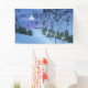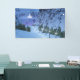 Eine 3D-Fantasielandschaft voller schillernder Schnee und zauberhafter Lichter. Eine Reihe von silbernen Glühlampen beleuchtet den Weg durch einen schneebedeckten Bergpass, der von steilen Felsklippen eingezäunt ist. Der schneebedeckte Pfad wird von dunklen Tannenbäumen eingezäunt. Auf der anderen Seite der Kluft erwartet der verzauberte Reisende auf seiner Reise nach Märyland ein durchsichtig leuchtendes Märchenschloss.