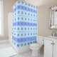 Einfache und hübsche Duschvorhang mit meinem Design von kleinen blauen Blumen mit dunkelblauen und hellblauen Streifen.