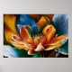 Eine lebhafte Blume entfaltet sich in einem farbenprächtigen Schauspiel, in dem feurige orangefarbene und goldene Blütenblätter mit coolen Blautönen tanzen. Das Kunstwerk strahlt Energie, Delikatesse und Erneuerung aus, als ob die Natur ihre Poesie in jedem Detail offenbart.
