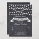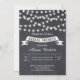 Lichterfolge und Vintages Banner auf der Tafel Sommer Hochzeitsdusche Einladung mit weißer, blinkender Lichterfolge oben und ein Vintag weißes Banner mit schwarzer Kontur auf Kalkboard oder schwarzer Tafel Hintergrund. Dieses moderne und trendige Hochzeitsdesign mit Vintagen Elementen ist Teil eines Hochzeitsgeschehens oder einer Hochzeitskollektion. Es ist vollständig anpassbar und eignet sich ideal für eine rustikale Hochzeitsfeier im Freien.