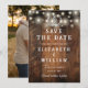 Diese rustikale Hochzeitseinladungskarte mit Lichterkette und Hufeisen kann mit Ihren Informationen in rustikaler Typografie auf einem Stallholzhintergrund und einem besonderen Foto auf der Rückseite personalisiert werden. Entworfen von Thisisnotme