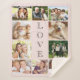 Eine rosa Foto Collage Sake Sherpa Decke mit 10 Fotos aus der Familie und "LIEBE", die vertikal in der Mitte in offener Typografie geschrieben wurde.