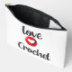 Bestellen Sie einen Crocheter, um die Neuheit zu tragen, die er für das Häkeln verwendet, wie Haken und Klebeband, große rote und schwarze Buchstaben und ein Herz. ‚Liebe 2 Crochet‘