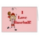 Liebe-Baseball-T - Shirts des Mädchen-I, Tassen, Karten, Porto, Aufkleber, Baseballmagneten, Taschentaschen, Hoodies und andere Baseballkleider- und -geschenkeinzelteile, die einen blonden behaarten Strichmännchenmädchen-Baseballspieler in einer roten und weißen Baseballuniform und in einem roten Text, der, kennzeichnen "mich Liebe-Baseball" liest!