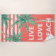 Modernes und trendiges Handtuchdesign aus tropischen Palmen mit handbemalten Palmen-Kunstwerken kombiniert mit modernem und trendigem Design aus Korallen und weißen Streifen. "Live Liebe Beach" wird in einem modernen Formen typografisch dargestellt. Kunstwerk von Moodthologie.