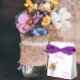Liebe ist in Blüte! Eine lebendige Hochzeitskollektion mit Blumenstrauß in einer Marmorvase, umgeben von Schmetterlingen und begleitet von Fuchsienscripttypografie.