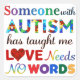 Inspiration Autismus Zitat von "Jemand mit AUTISM hat mir gelehrt, LIEBE braucht keine WÖRTER" mit bunten Worten und Autismus Rätseln, um autistische Kinder und ihre Familien zu unterstützen.