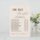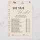 Feiern Sie die Braut mit unserem charmanten Brautparty He Said She Game! Die Gäste werden sich freuen zu erraten, wer mit diesen lustigen und aufschlussreichen Fragen über das glückliche Paar gesagt oder getan hat. Dieses Spiel mit wunderschönen Wildblumen ist die perfekte Ergänzung zu Ihren Brautparty-Festlichkeiten. Es ist eine wunderbare Art, mehr über Braut und Bräutigam zu erfahren und dabei unvergessliche Momente zu schaffen. Lass den Spaß beginnen und sehen, wer das Paar am besten kennt!