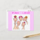 Illustrator & Cartoonist April McCallum, "Eyebrows & Making Impressions" für das Brustkrebsbewusstsein. Ihre "rosa Liebe" Brustkrebsillustrierung in sanften, frischen Farbtönen und Gelb zeigt fünf Frauen mit Glatzköpfen mit einer Kappe, Blume, Herz oder Wirbel. Text: "PINK LIEBE".
