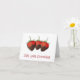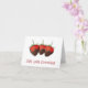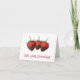 Drei Erdbeeren zeigen humorvolle "Live, Liebe, Schokolade". Eine schöne Karte zum Valentinstag.