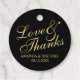 Eine elegante Hochzeitsfavoriten-Tags mit dem Titel "Liebe & Dank" im eleganten, goldfarbenen Script-Schriftart-Stil mit Braut- und Bräutigam-Namen und Hochzeitsdatum in goldener Serif-Schriftart-Stil auf schwarzem Hintergrund. Bitte beachten Sie: Die Details der Folie werden im Kunstwerk simuliert. Bei der Herstellung dieses Produktes wird keine Folie verwendet.