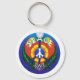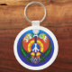 Eine farbenfrohe Schlüsselkette mit Symbolen für Ruhe und Liebe.