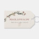 Dieses elegante "Peace, Liebe & Joy"-Geschenk-Tag mit modernem und minimalem grünem Blattwerk mit roten Blumenakzenten auf einem neutralen, warmen Hintergrund. Der Text ist leicht personalisiert mit Ihrer Wahl der Begrüßung, Familienname, Jahr.