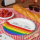 Liebe Gleichberechtigung Liebe ist Liebe Typografie oder Ihr Text, farbenfrohe gestreifte Muster Regenbogenflagge LGBT Lesbische Gay Pride Party Papier Teller