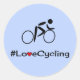 Dieser lustige Aufkleber für einen begeisterten Radfahrer hat ein Single-Radfahrer-Piktogramm und den Hashtag-Slogan #LoveCycling. Das "V" der Liebe wurde in ein rotes Herz verwandelt und der Hintergrund ist hellblau.