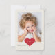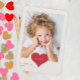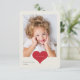 Eine einfache, minimale Foto-Tageskarte mit modernem Rotherz, Liebe innen auf einem sauberen und schlichten, weißen Hintergrund. Der zugehörige Musterbacker weist ein sich wiederholendes Herzmuster in rot und weiß auf.