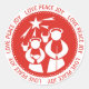 Liebe, Friede, Joy Nativity Scene roter Weihnachtsaufkleber mit einem minimalen Krippe in Weiß auf rotem skallopiertem Hintergrund. Dieses Urlaubsdesign ist komplett anpassbar