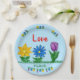 Garten Blume goldgelbe Sonnenblume, blau-gelbe Blüte, lila Tulpe in Blüte im Garten Gras. Sommerliche lustige bunte Folk Art Feeling. Liebe Friedenstypografie in rot und grün geschrieben. Original Artwork Design von TamiraZDesign.