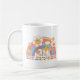 Ein hübsches Sprichwort im Groovy-Stil mit Regenbogen mit Blume und Pilzen, das lautet: Vor allem zeigen Sie sich selbst Liebe.