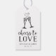 Versenden Sie Ihren Gästen Zuhause mit Wein, Champagner oder kleinen Flaschen ihrer Lieblingslibation? Bringen Sie diese süß-schicken Tags für eine persönliche Touch an. Gefälligkeitstags verfügen über ein Paar Champagnerflöten, die von einem Brausenherz begleitet werden, mit "Beifall zur Liebe" in der Kalligraphie-Schrift und der Vintagen Blocktypografie. Passen Sie diese skurrilen, aber eleganten Schwarz-Weiß-Tags mit Ihren Namen und Hochzeitstermin an.