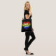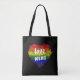 Spezielle Stolz Slogan Tote Tasche. Schwarze Tasche mit einem niedlichen Herz geschmückt in den Farben des stolzen Regenbogens. Liebe gewinnt Text wird in fett weißer Kalligraphie über das Herz gedruckt. Der Text kann leicht personalisiert werden. Fühlen Sie sich frei, es zu bearbeiten und durch einen kurzen Slogan, der Ihre Ansichten und Ideen am besten zum Ausdruck bringt.