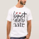 Dieser weiße T - Shirt enthält das Wort "Liebe" in einem fließenden schwarzen Skript mit zwei kleinen roten Herzen darüber. Unten steht "Nicht hassen" in einem kleineren, etwas skurrilen schwarzen Schriftart. Rechts von "Liebe" befindet sich ein schwarzes Kreuz. Dieses Design fördert eine Botschaft der Liebe und Positivität, die ein religiöses Symbol beinhaltet.