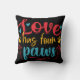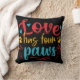 Farbenfrohe, lustige Kissen für Hundefreunde mit coolem Rot-, Gelb- und Blautext auf einem Hintergrund, den Sie in jede gewollt Farbe ändern können, und Text, der Liebe hat Vier Pfoten!