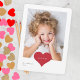 Eine einfache, minimale Foto-Tageskarte mit modernem Rotherz, Liebe innen auf einem sauberen und schlichten, weißen Hintergrund. Der zugehörige Musterbacker weist ein sich wiederholendes Herzmuster in rot und weiß auf.