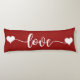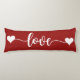 Wunderschönes riesiges, langes Kissen mit rotem Hintergrund und Herzformen sowie grafischer Typografie, die Liebe sagt. Dieses Kissen ist ein großartiges Geschenk für die Freundin, Ehefrau, Freund oder Ehemann.
