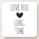 Niedlicher und trendiger Typografie-Untersetzer mit den Worten "Liebe du long time" in einem schwarzen Text auf weißem Hintergrund, und ein kleines schwarzes Herz in der Mitte.
