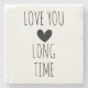 Niedlicher und trendiger Typografie-Untersetzer mit den Worten "Liebe du long time" in einem schwarzen Text auf weißem Hintergrund, und ein kleines schwarzes Herz in der Mitte.