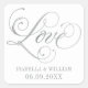 Gastgeschenk Hochzeit Aufkleber "Liebe" in silbergrauem Schriftsatz mit einer eigenen Monogramm-Design, das den Namen und das Hochzeitstermin der Braut und des Bräutigams enthält.