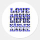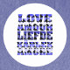Suchen Sie Aufkleber zum Thema Liebe? Auf diesem Aufkleber wird die Liebe in Englisch, Italienisch, Französisch, Niederländisch und Schwedisch mit einem Herzmuster in verschiedenen Blautönen dargestellt.