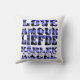 Mögen Sie Liebe-Themed Kissen? Dieses Kissen sagt Liebe in Englisch, Französisch, Niederländisch, Schwedisch und Italienisch mit blauen Herzen.