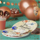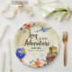 Liebe zu reisen ist ein Abenteuer Brautparty Teller. Das Design umfasst Vintages Gepäck, Kugel, Flugzeug, Pass und Aquarellblumen. Brautparty zum Thema Reisen.