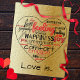 Wortwolke Herz geformt personalisiertes Puzzle-Design mit wiederholenden Wörtern in verschiedenen Schriftart in rot und schwarz auf einem goldenen Hintergrund. Die LIEBE IST ... ist anpassbar.