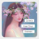 Sticker für Inspirationskunst. Fairytale Fantasy Art. Schöne, märchenhafte Engelin mit Blume in einem weißen Seidenkleid. Hübscher, blumenreicher lila Hintergrund. Weibliche Kunst. Generativität