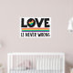 LGBTQ Stolz Monatsposter mit der Beschriftung "Liebe ist nie falsch" in schwarz all caps Schriftart mit einem kleinen Regenbogenherz und einem farbigen Streifen auf weißem Hintergrund.