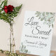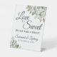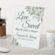 Dieses hübsche Tafelschild eignet sich perfekt für eine Leckerei an Ihrem Hochzeitsempfang. Es zeichnet sich durch ein schlichtes und dennoch elegantes Design aus, mit extravaganten Schriftzeichen und handgemalten Blätter aus Eukalyptus und Gartengrün in Minznuancen, Moos und Salbei-Grün. Das Schild lautet: Liebe ist süß, bitte nehmen Sie eine Leckerei! Es gibt Platz für Ihre Namen und das Hochzeitstag unten.