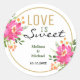 Liebe ist süße Gefälligkeitsmarken perfekt für Süßigkeiten Gastgeschenke Hochzeiten. Personalisieren Sie die floralen Hochzeitsaufkleber mit Braut- und Bräutigam-Namen und Hochzeitsdatum.