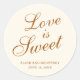 Elegante Hochzeitsbegünstigen Aufkleber mit der Meldung "Liebe ist süß" in Kupferskript und Ihren Namen und Datum unten in einem Serif-Schriftart, über einen Elfenbeinhintergrund. Die Schriftart und Hintergrundfarben können beliebig verändert werden. Diese einfachen Aufkleber fügen Ihren Favoriten eine persönliche Touch hinzu.