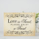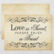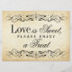 Dekorative Wirbel und Schnörkel umrahmen dieses Vintag inspirierte, elegante "Liebe ist süß, bitte genießen Sie eine Leckerei" Dessertschild. Hintergrund, der ein antikes Elfenbein strukturierte Stil hat.