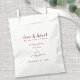 Die elegante, klassische Gastgeschenk Hochzeit-Tasche bietet "Liebe ist süß, bitte nehmen Sie eine Leckerei!" Zitat mit den Vornamen der Braut und des Bräutigams und dem Datum der Hochzeitsfeier in trendigem Bordeaux auf einem transparenten Hintergrund, der Ihre Wahl von Farbpapier zeigt. Dieses moderne, einfache Design bietet zeitlose, klassische Eleganz. Personalisieren Sie die Namen des Paares und das Veranstaltungsdatum in eleganter Schrift und Schrift. Diese sind eine perfekte Begleitung für jede Hochzeitsfeier, um Ihre Gäste zu schätzen! Achten Sie darauf, den Sammellink auf dieser Seite zu sehen, um alle passenden Elemente anzuzeigen! Bitte richten Sie Fragen oder Anfragen an invitationsuites@gmail.com.