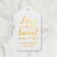 Elegante, kundenspezifische Hochzeitsfavorisierungstags zeichnen sich durch eine echte Goldfolientypografie auf der Vorderseite aus, mit der modernen Herzkalligraphie-Schrift "Liebe ist süß", sowie einem stilvollen, minimalen Monogramm der Braut- und Bräutigam-Vornamen, dem Hochzeitstag und der personalisierten "Genießen Sie eine Leckerei". Auf der Rückseite des Tags befindet sich ein Foto des Ehepaares.