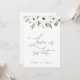 Dieses prächtige Schild besticht durch einen von Hand gezeichnet Strauß mit Aquarell, Eukalyptus, Salbei und Anemonen, ergänzt durch einen modernen Kalligraphie-Schriftart. Das gepflegte und moderne Design sorgt dafür, dass das Schild sowohl stilvoll als auch leicht lesbar ist. Ideal für Paare, die gewollt haben, ihre Hochzeitsplanung zu optimieren, ohne dabei den Stil zu opfern, kann dieses Schild durch Klicken auf "Details" personalisiert werden. Um den Text anzupassen oder die Größe, den Schriftart oder die Farbe zu ändern, klicken Sie auf "Bearbeiten mit dem Entwurfswerkzeug". Dieses elegante Schild wurde entworfen, um sich nahtlos mit der "Evergreen Garden" Wedding Invitation Collection abzustimmen. Karo den Link Kollektion auf dieser Seite, um alle passenden Objekte in diesem schönen Design zu erkunden.